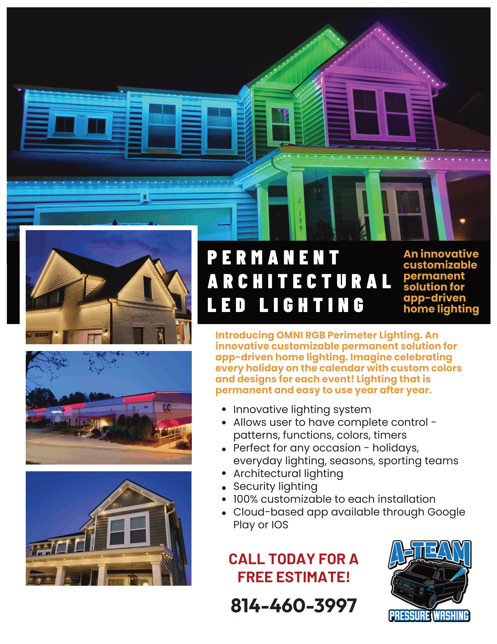 A-Team Pressure Washing proudly offers professional permanent lighting installation in Erie, PA using high-quality Omni Permanent Lighting systems.
